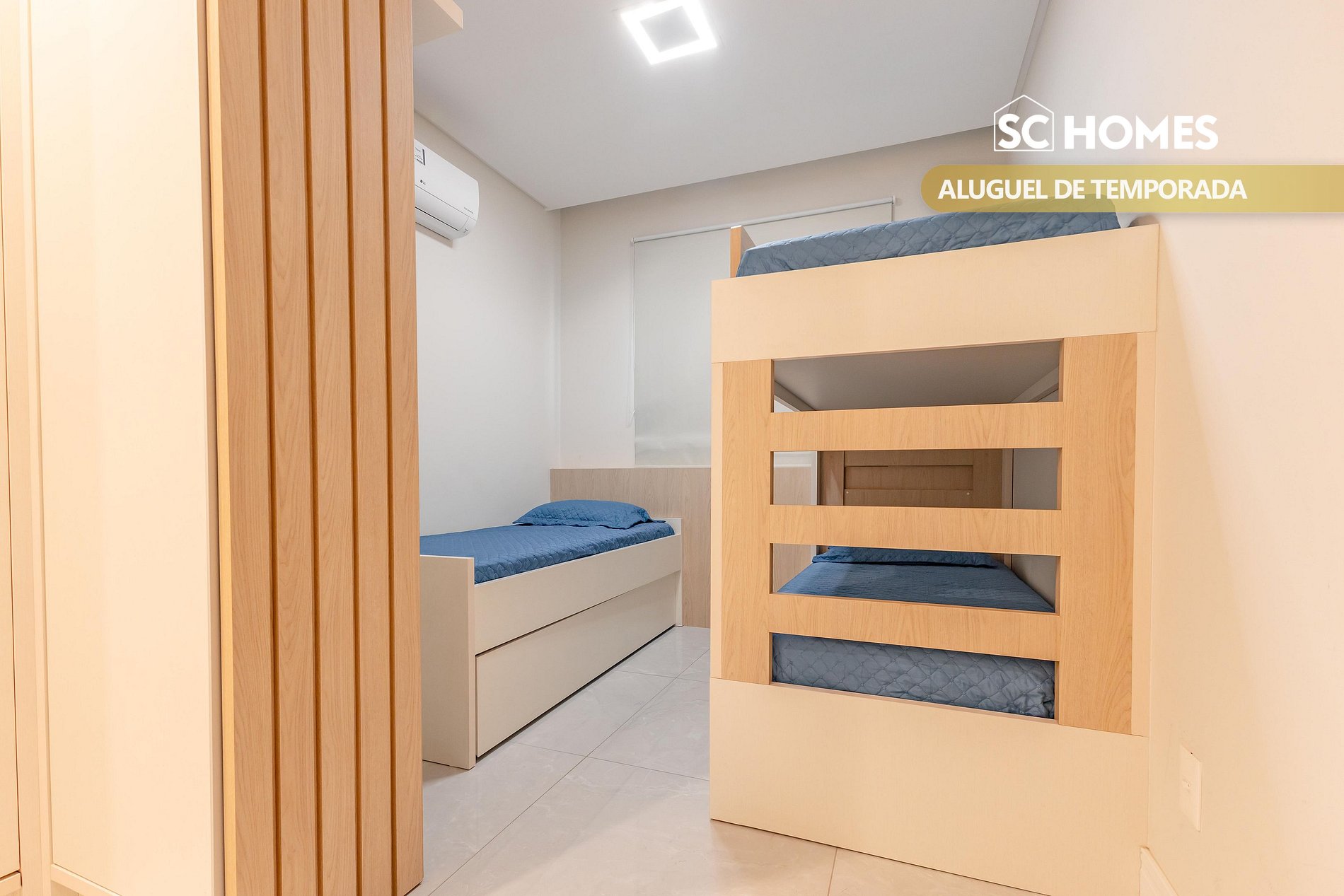 - Un dormitorio con cama individual con cama supletoria + 1 litera y aire acondicionado split;