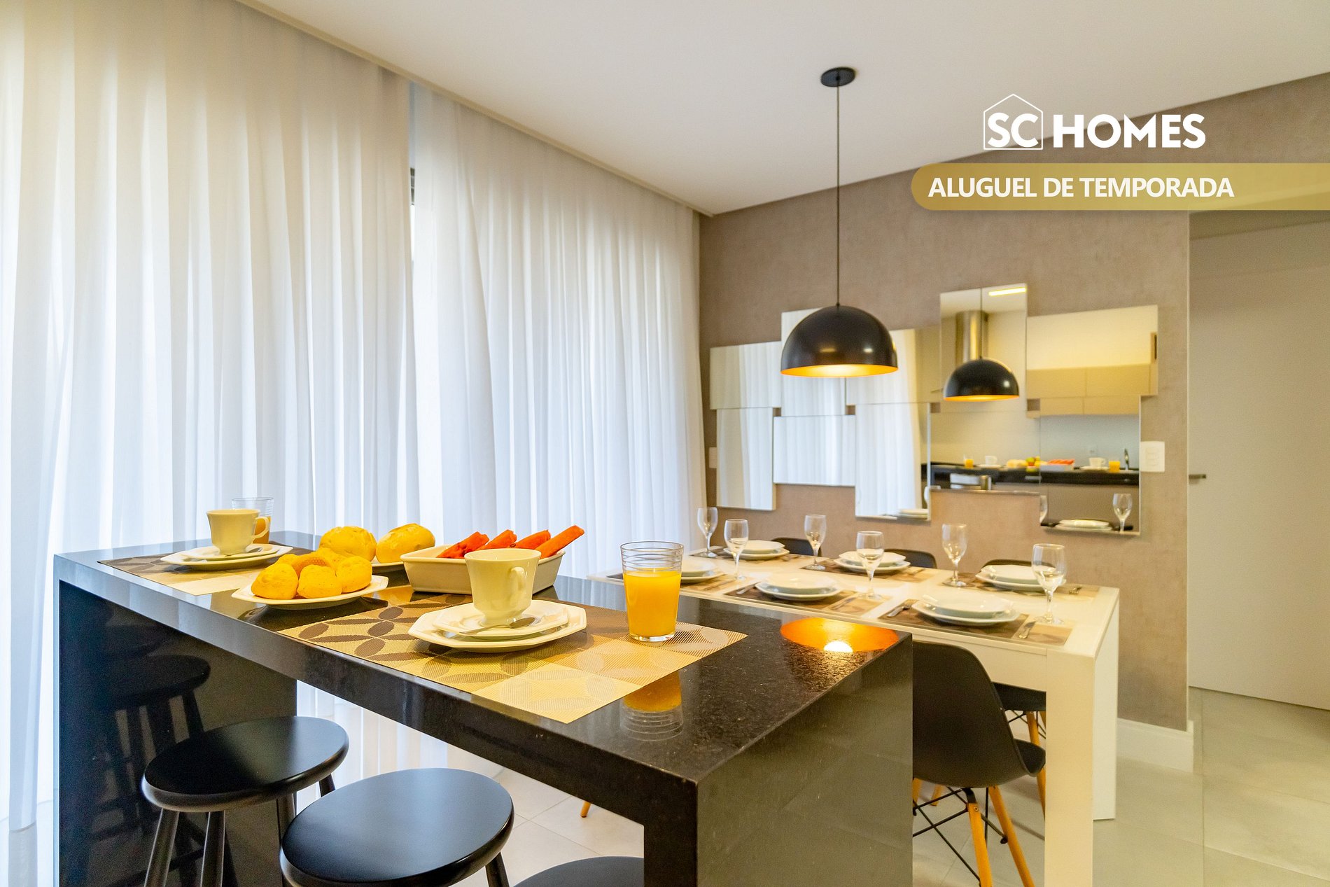 - Sala de estar e jantar integradas com TV de LCD e ar condicionado split;