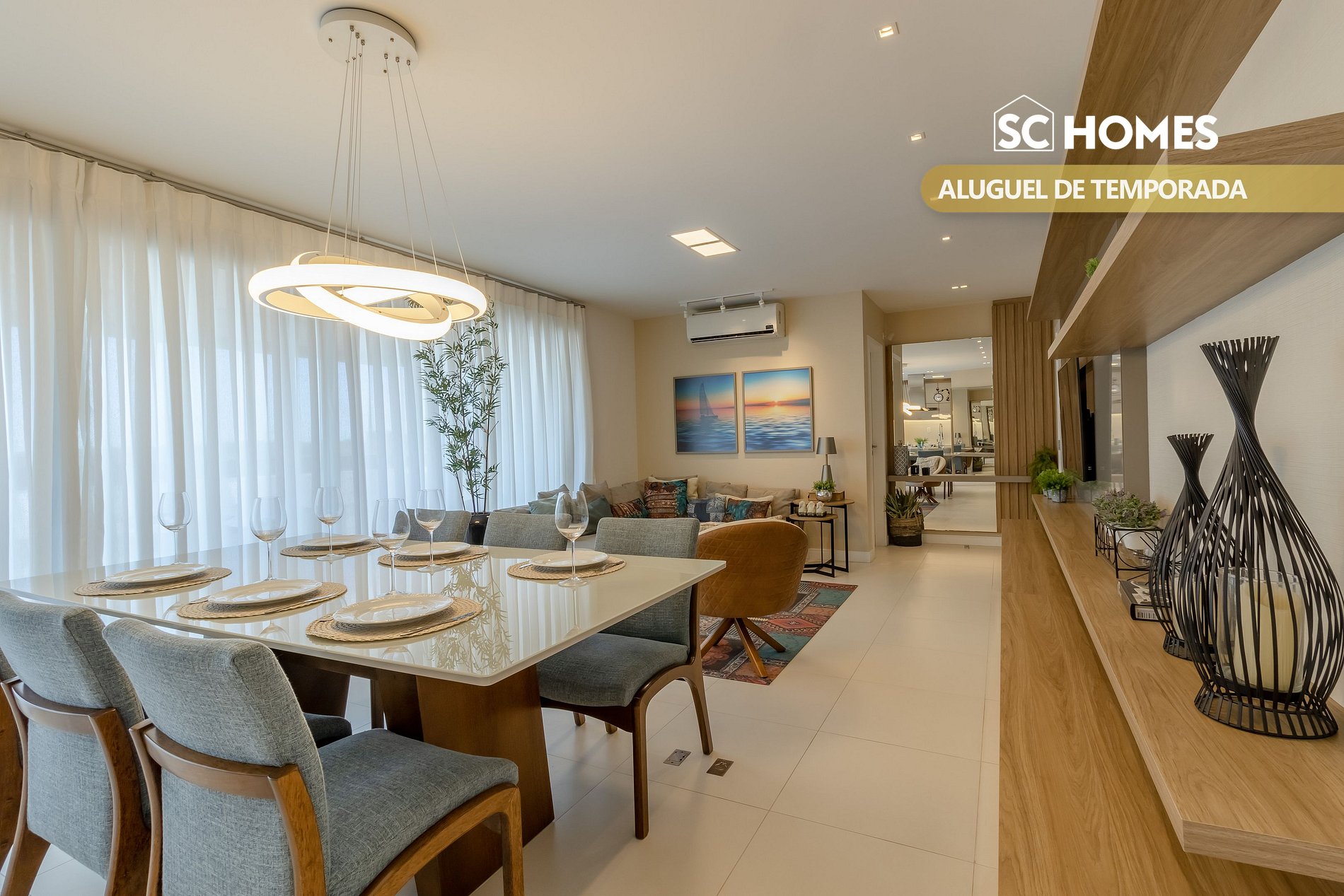 - Sala de estar e jantar integradas com TV e ar condicionado split;