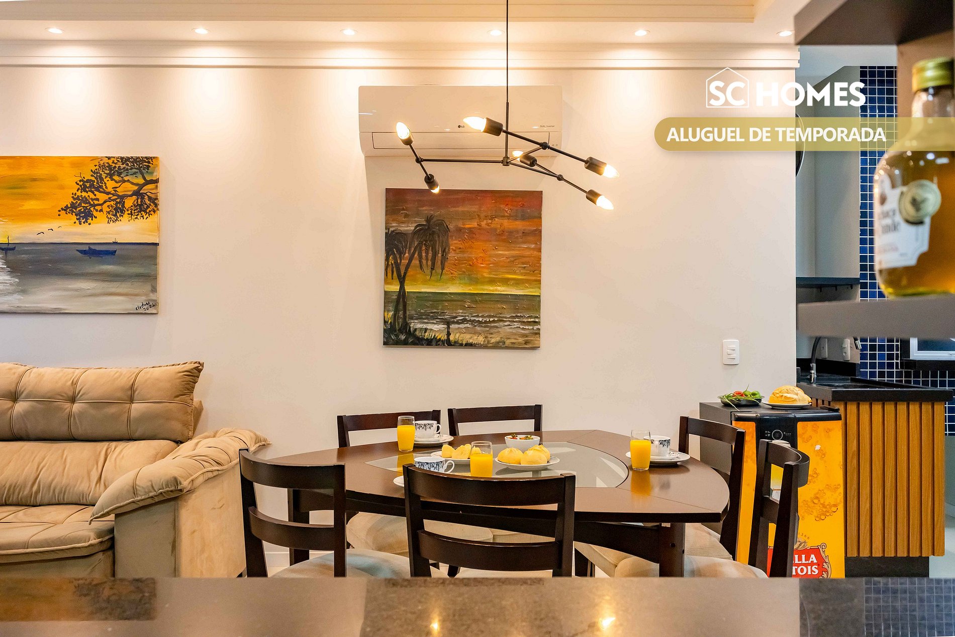 O apartamento tem capacidade para até 04 pessoas em 02 dormitórios (incluindo crianças de qualquer idade), com cozinha, sala de estar e jantar, área de serviço, churrasqueira e garagem.
