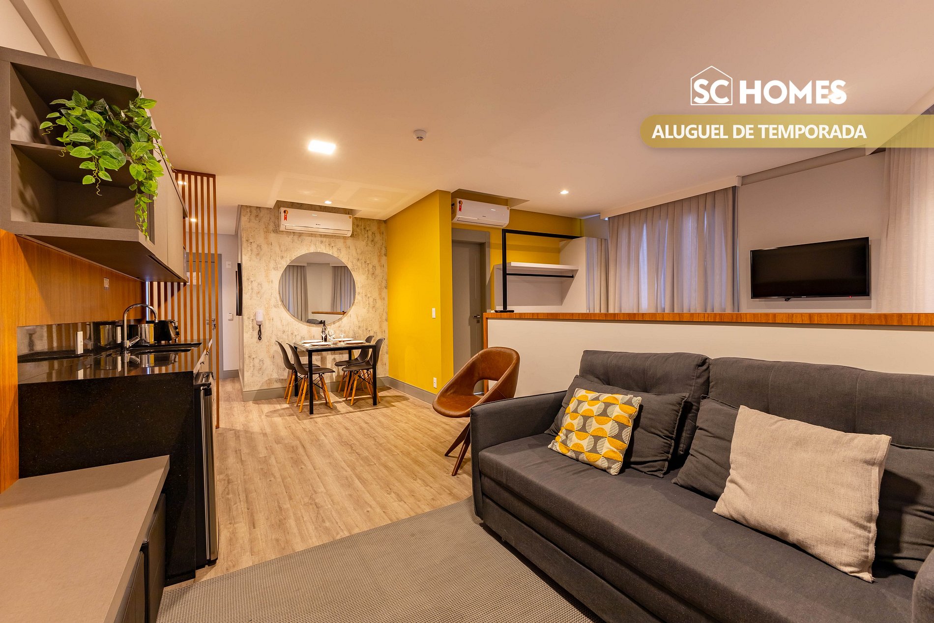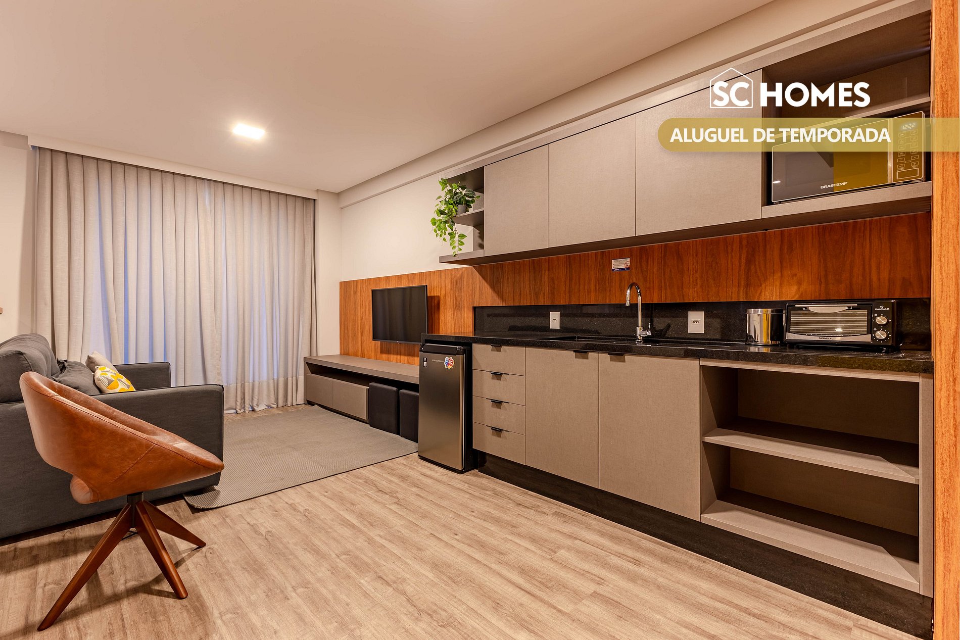 - Cozinha equipada, fogão de indução de 1 boca (sem churrasqueira).