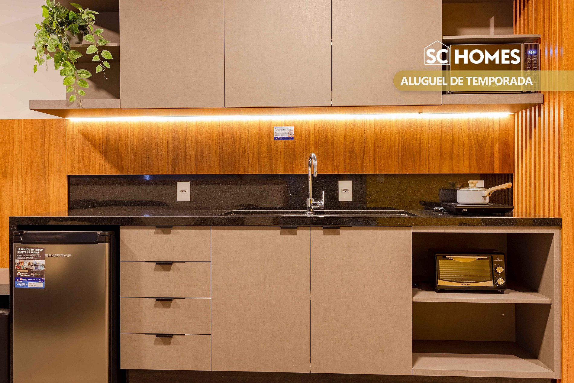- Cozinha equipada, fogão de indução de 1 boca (sem churrasqueira).