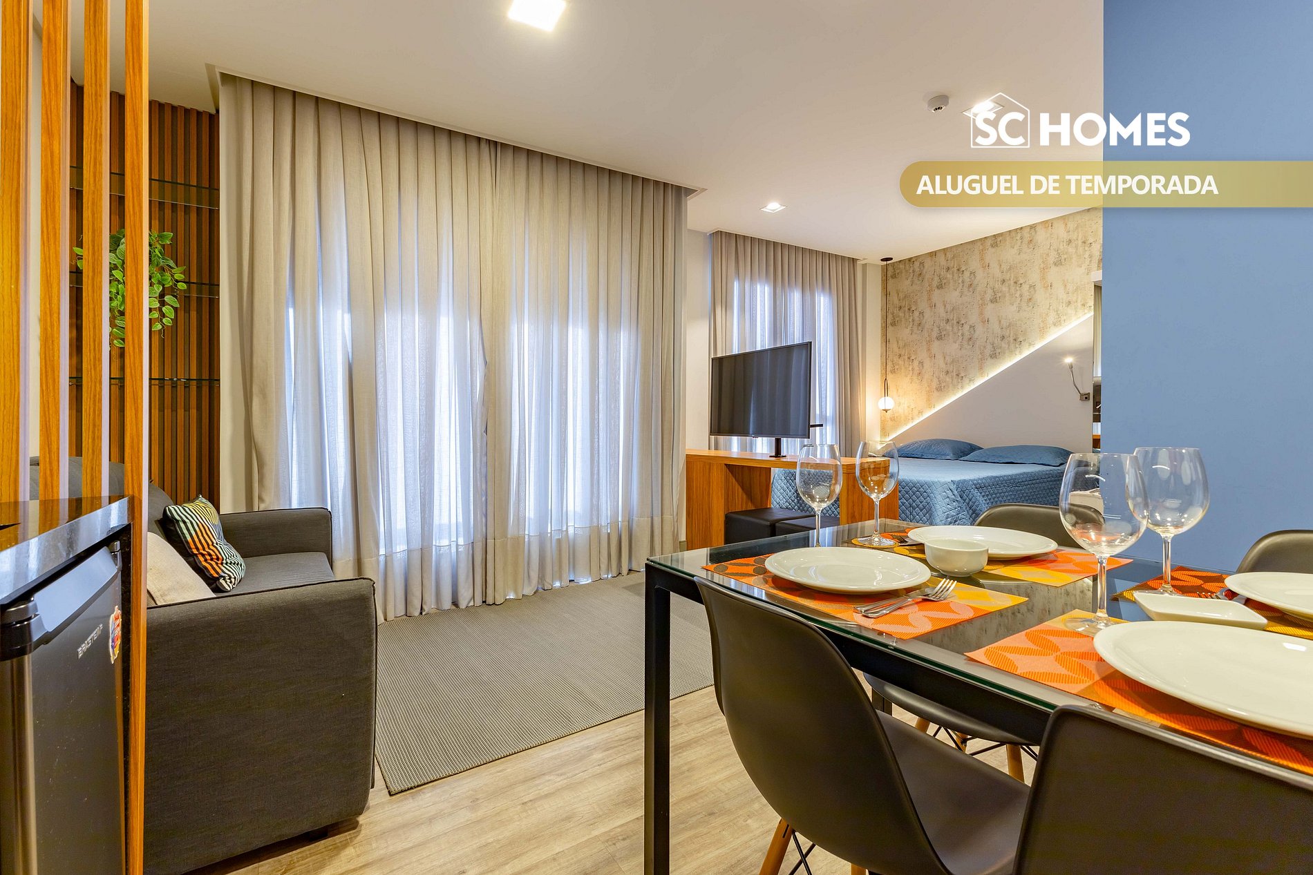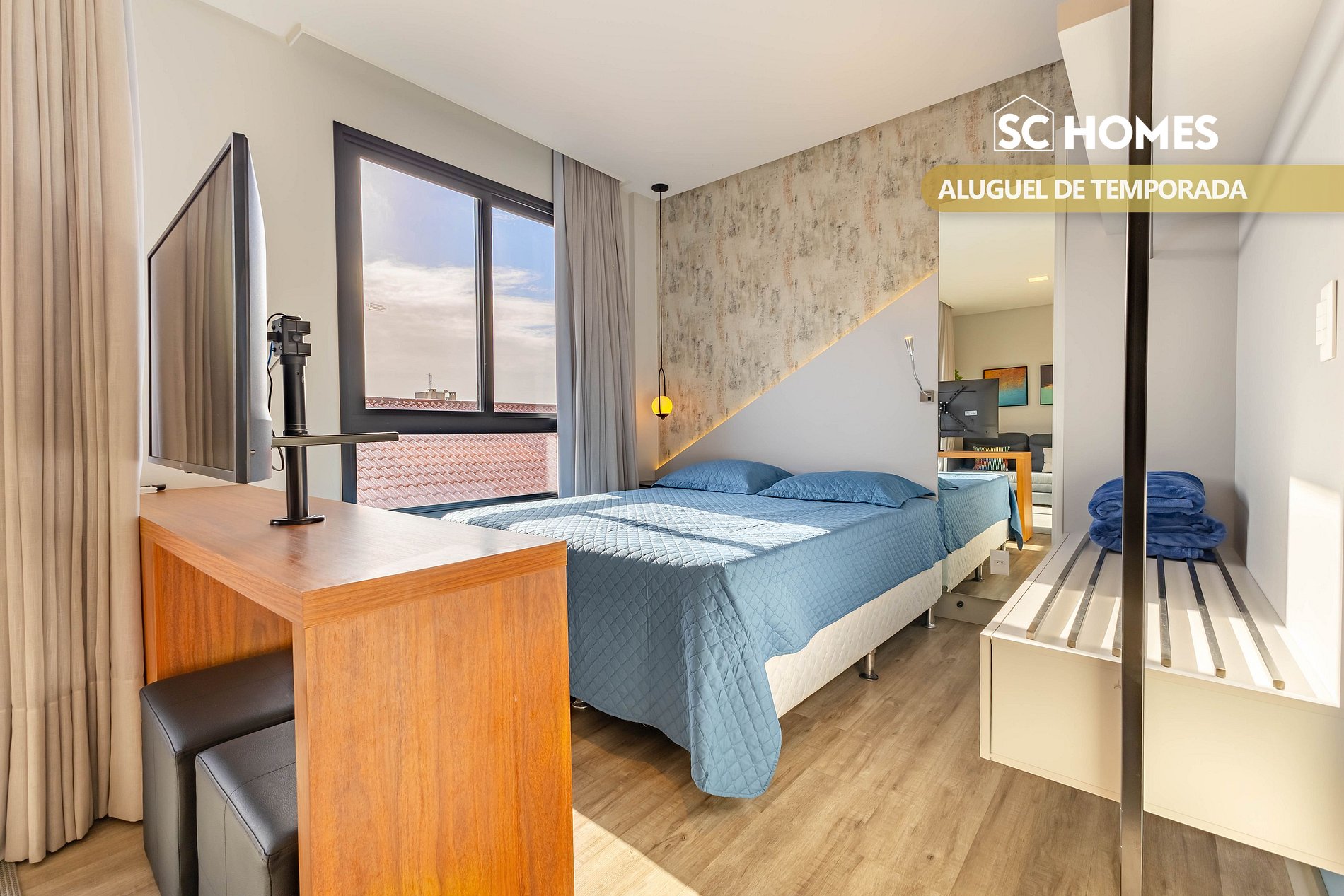 - Um ambiente climatizado com cama box de casal tamanho Queen Size e sofá cama de casal e smart TV;