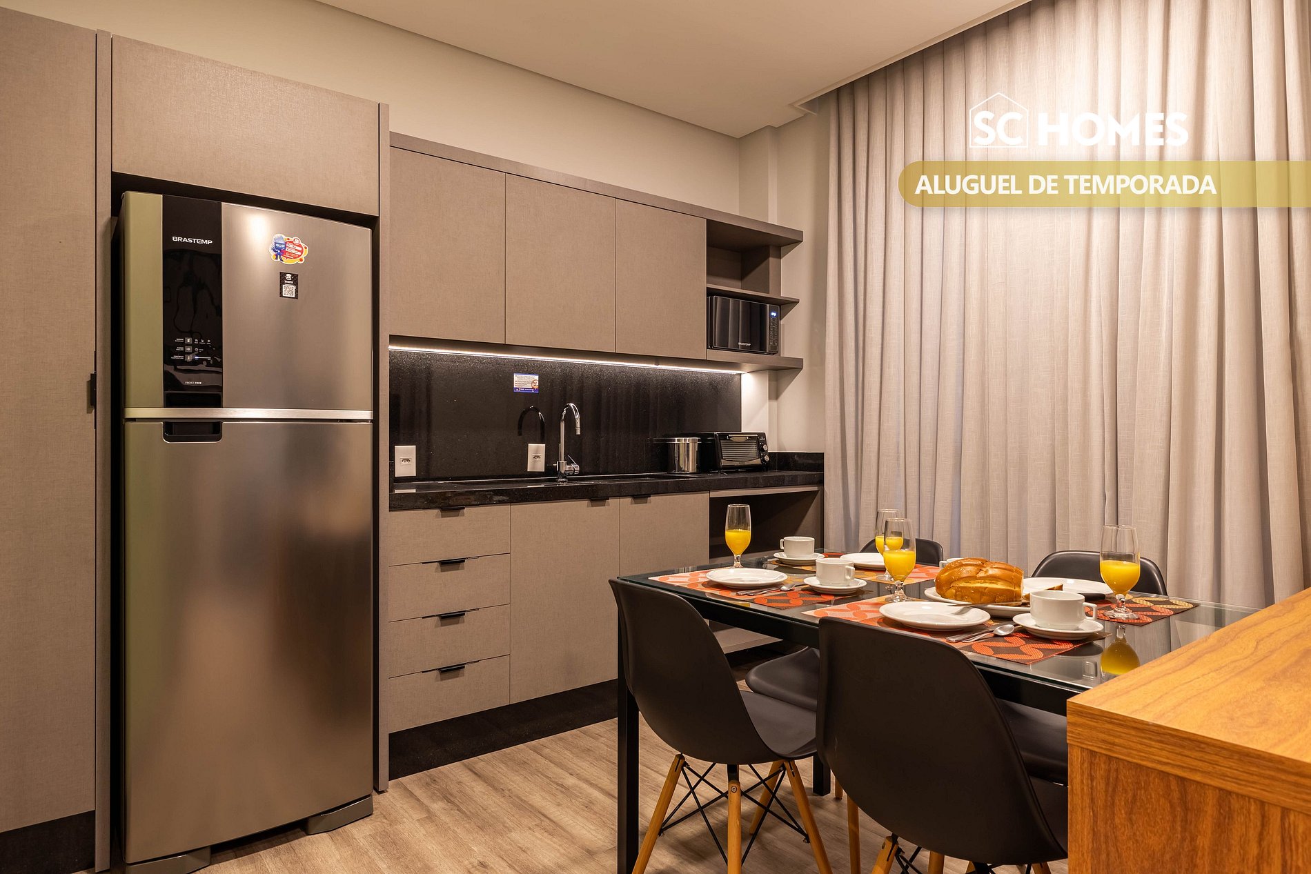 - Cozinha equipada, fogão de indução de 1 boca (sem churrasqueira).